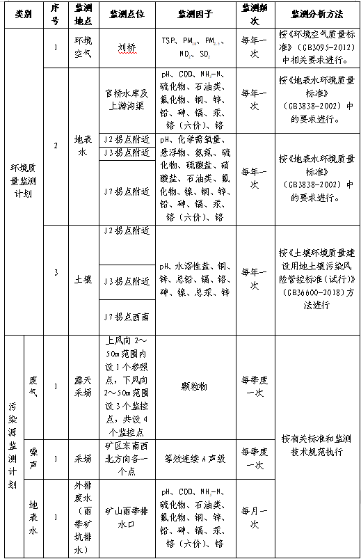 (6)招標(biāo)范圍及內(nèi)容:對(duì)興天礦業(yè)諭興礦進(jìn)行環(huán)境監(jiān)測(cè)和檢測(cè),包括但不限于土壤、地下水、廢水、廢氣、噪聲等污染源進(jìn)行監(jiān)測(cè)和檢測(cè),每月出具監(jiān)測(cè)和檢測(cè)報(bào)告。監(jiān)測(cè)和檢測(cè)報(bào)告需滿足各級(jí)主管單位、國(guó)家法律法規(guī)、行業(yè)檢測(cè)標(biāo)準(zhǔn)、《滁州市興天礦業(yè)有限公司安徽省天長(zhǎng)市諭興地區(qū)建筑用玄武巖礦年產(chǎn) 800 萬(wàn)噸露天采礦項(xiàng)目環(huán)境影響報(bào)告表》中所涉及范圍等要求,保證審批順利通過(guò)。